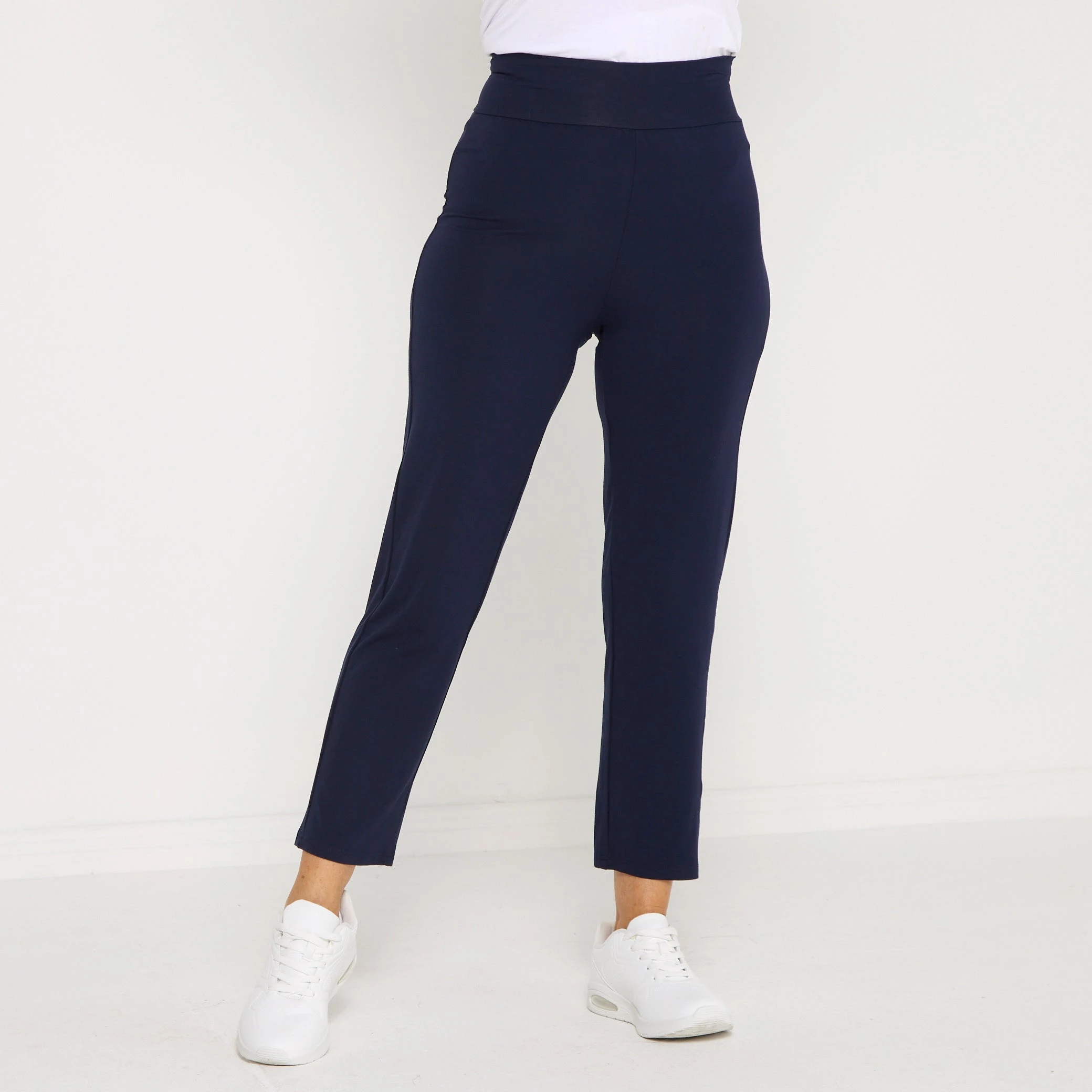 - Design: Wide soft waistband (no elastic), fold-over or high-waist wear option, slightly tapered leg, ankle-cropped length