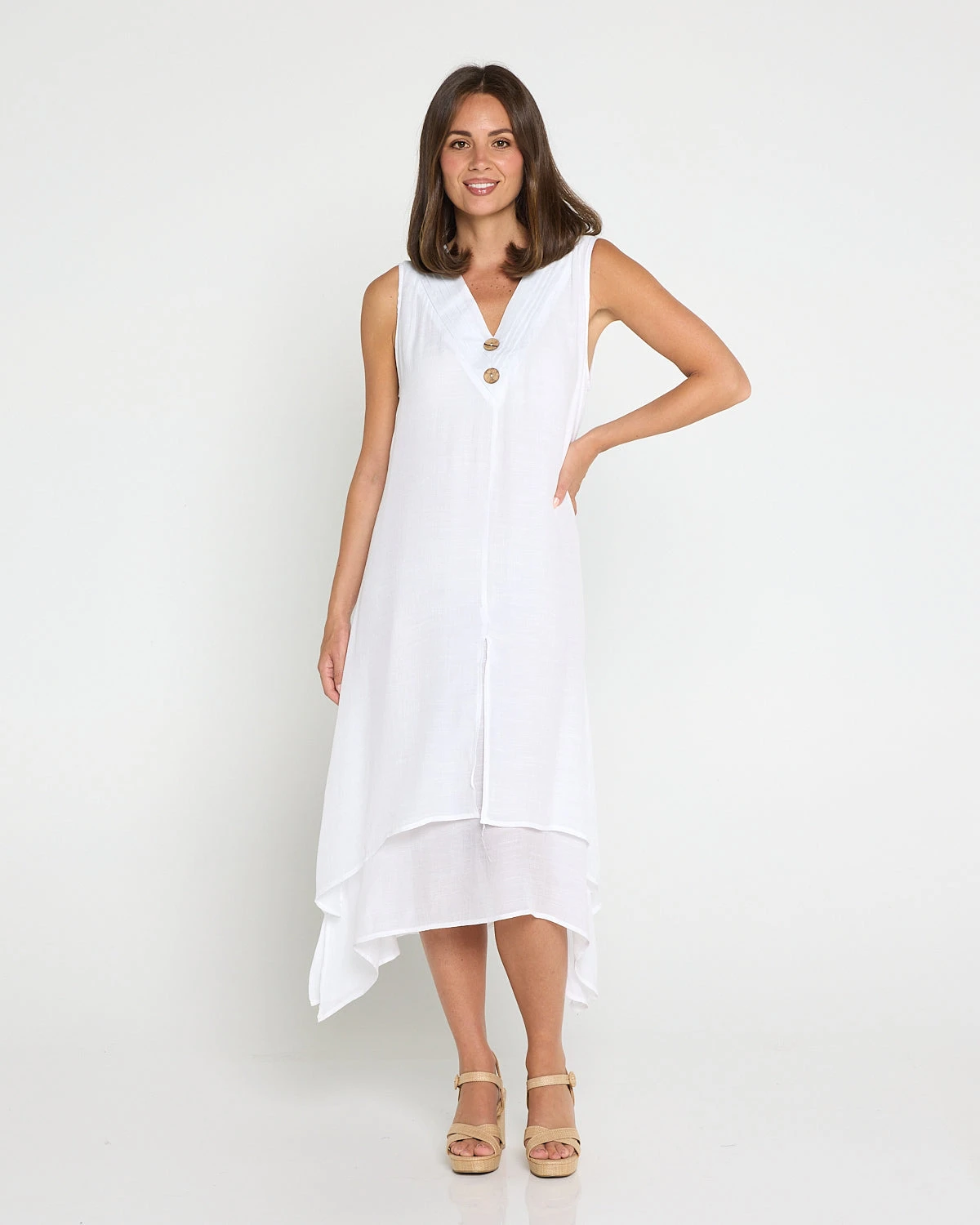 Elegant in its simplicity, the Averaine  Capricorn Sleeveless Layered Dress in fresh white is designed to move beautifully with the body while offering confident, comfortable coverage. The softly draped two-layer construction creates an effortlessly refined look, with a longer underlayer that adds a subtle flowing hemline and smooth, lined comfort. Finished with a flattering V neckline and sleeveless cut, it’s an easy one-and-done style for warm days, holidays, and relaxed evenings just add sandals or wedges and go.