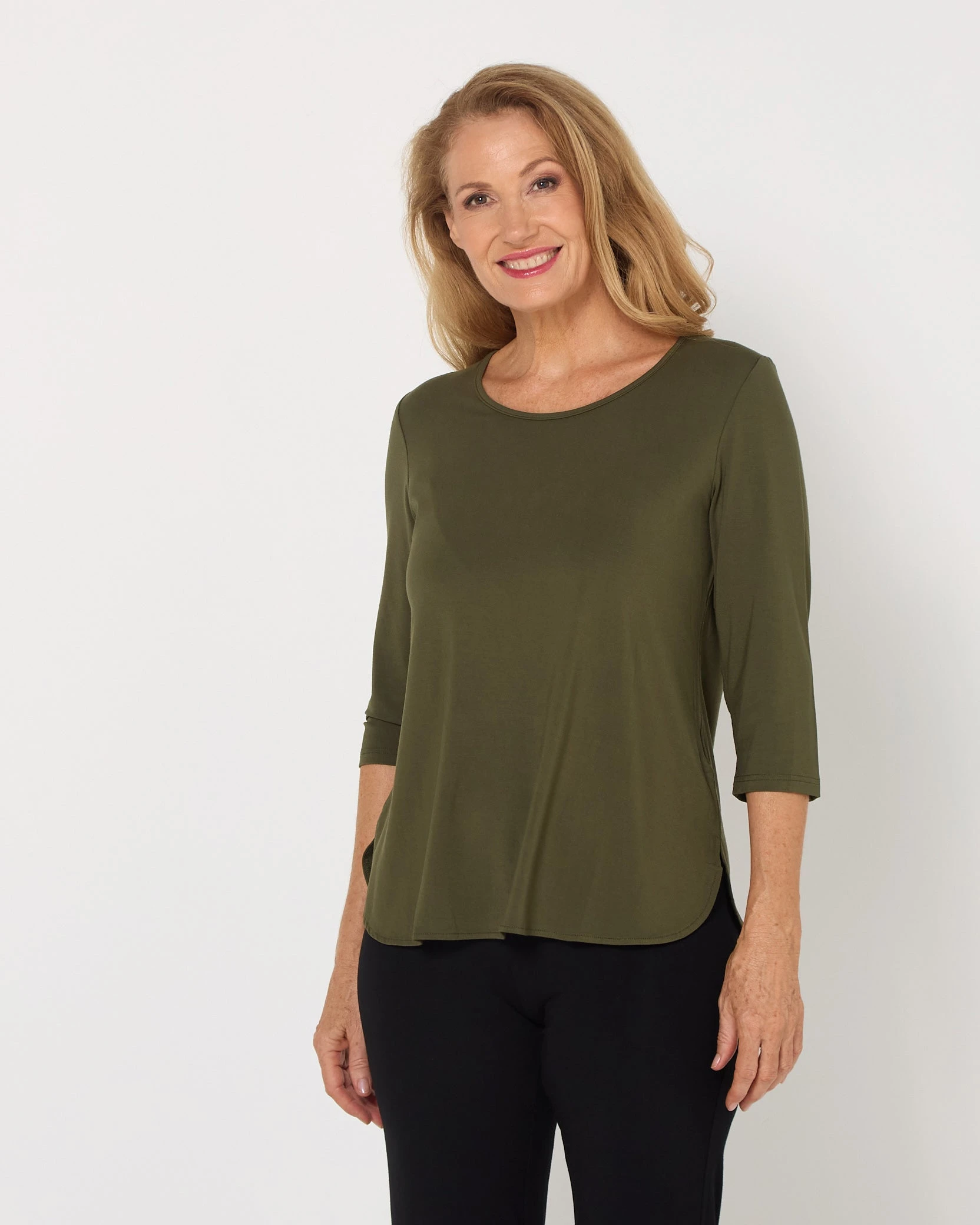 - Design: Scoop neckline, three-quarter sleeves, hip length, softly scooped hem, side splits