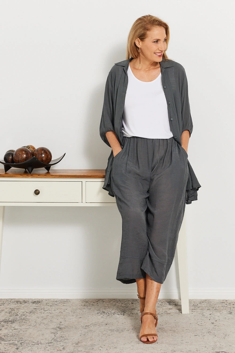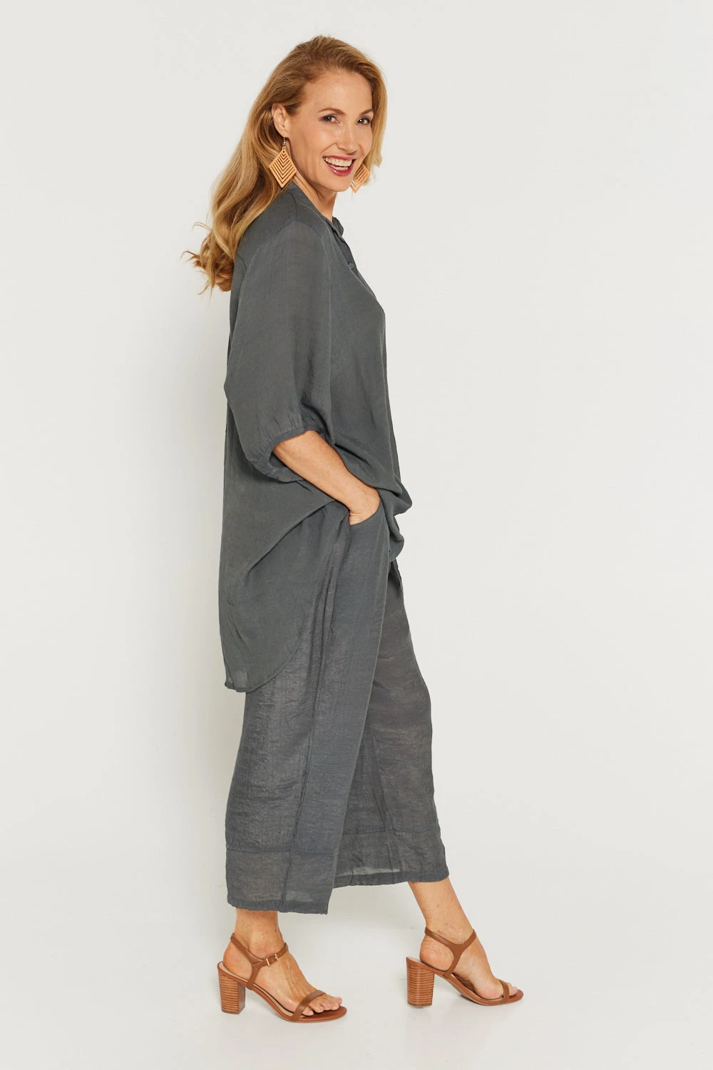 This shirt does it all: soft drape, breathable comfort, and effortless styling. While the longline shape and hi-low hem give flattering coverage whether you’re pairing it with denim, tailored pants, or slim leggings.