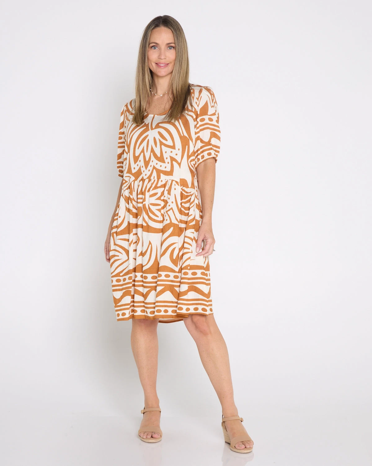 Warm, earthy and effortlessly easy, the Averaine Dress in Ochre Island is made for sunlit days and relaxed plans. Featuring a bold ochre-and-ivory island-inspired motif, this throw-on style delivers instant holiday energy in an easy above-the-knee length. The lightweight crinkle-style rayon-nylon blend drapes softly over the body, while a gently gathered waist seam adds shape without clinging. Finished with elbow-length puff sleeves and elastic cuffs, it’s the kind of comfortable, flattering dress you’ll reach for on repeat.