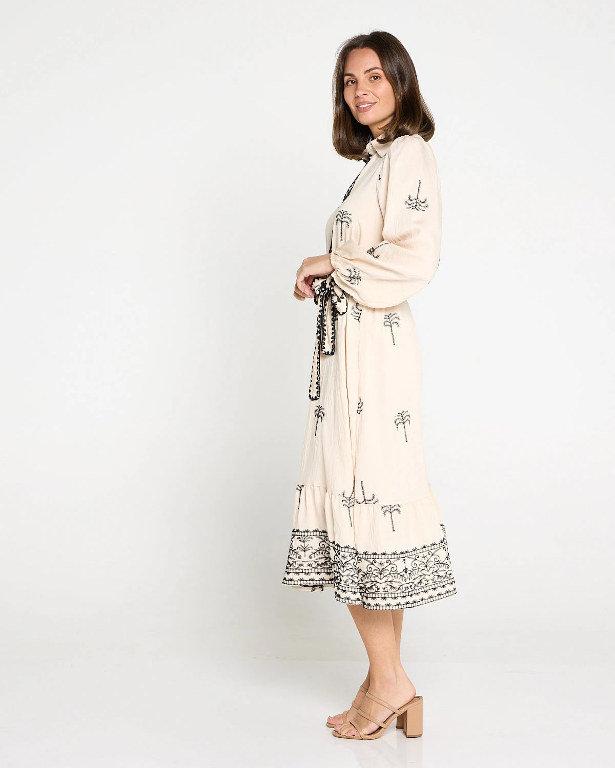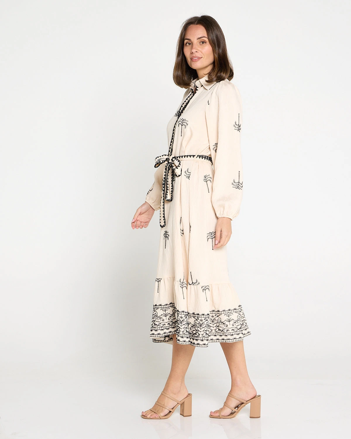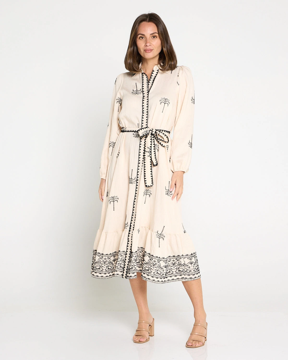 The Averaine Embroidered Dress in cream is a refined statement piece that blends relaxed comfort with elevated detailing. Contrasting black embroidery brings a timeless, artisanal finish, while the lightweight woven fabric drapes fluidly for an easy, breathable feel. Designed with a V neckline and shirt collar, a button-down front, and long sleeves with elasticated cuffs, it’s effortless to wear from day to evening. A removable embroidered waist tie lets you define the shape, and the tiered hem with border embroidery adds soft movement through the midi-length silhouette.