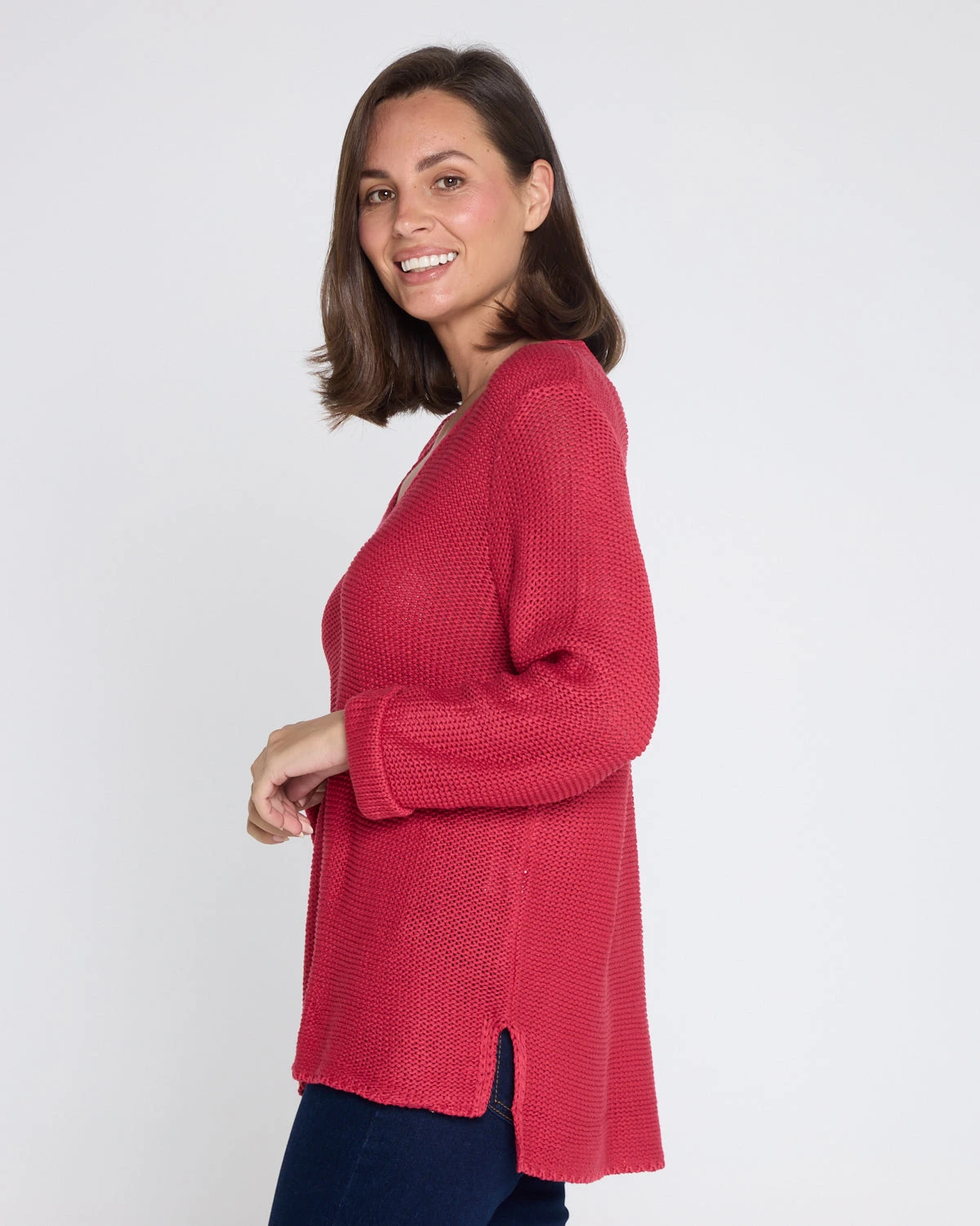 Bold yet beautifully wearable, the Averaine Cotton Knit Jumper in Cherry Red is an effortless way to add colour to your everyday wardrobe. Designed with a flattering V-neck and relaxed drop-shoulder shape, it drapes comfortably without feeling bulky. The reverse-facing knit texture adds subtle dimension, while small side splits and a slightly longer back hem create an easy, flattering finish-perfect worn solo or layered through cooler days.