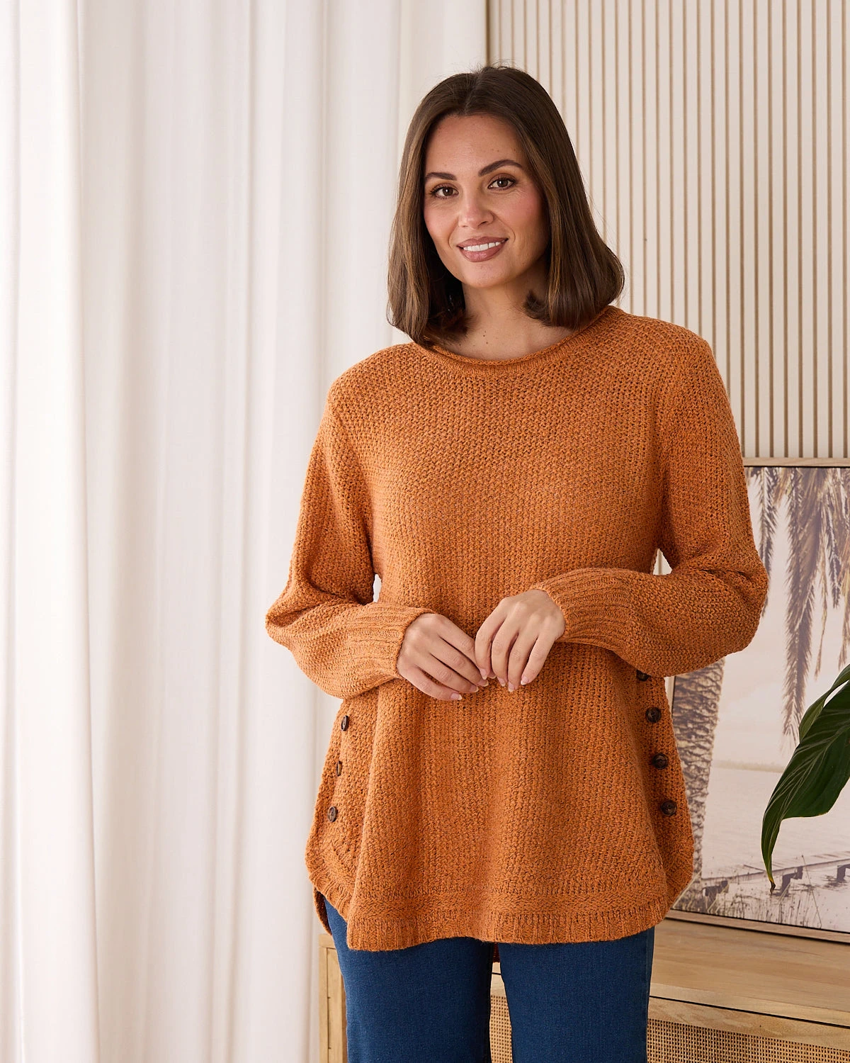 It’s warm, comfortable, and effortlessly put-together. The heavier knit delivers real cold-day comfort, the rolled-edge neckline keeps it relaxed, and the scooped hem creates a flattering line over jeans or tailored pants. Side button detailing adds a refined point of difference.