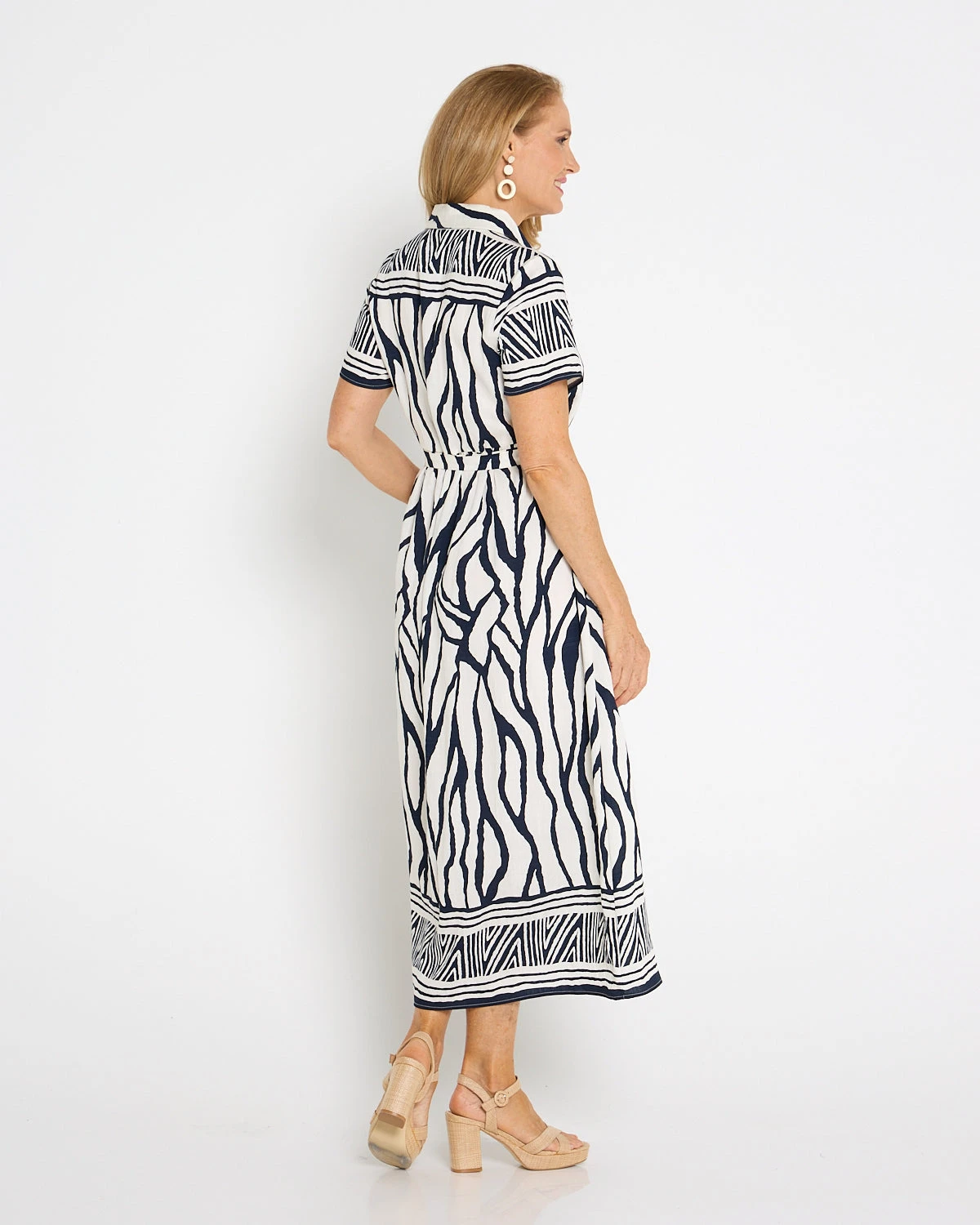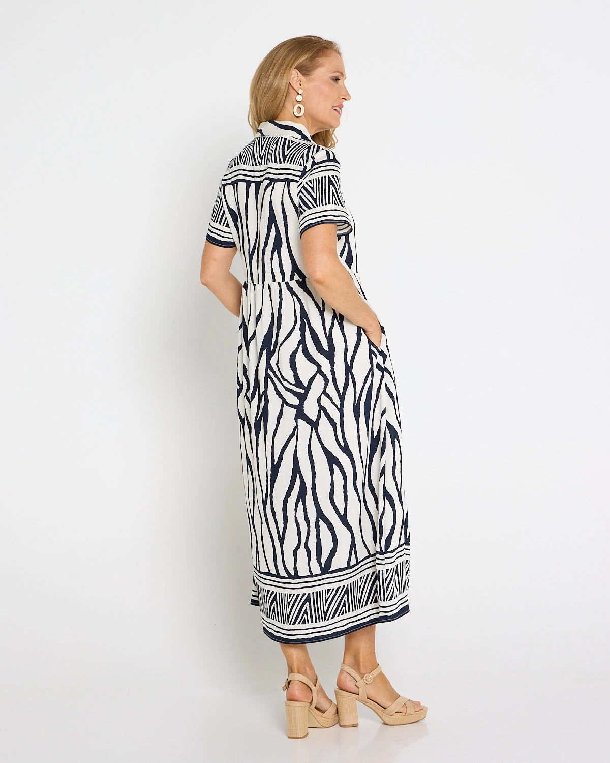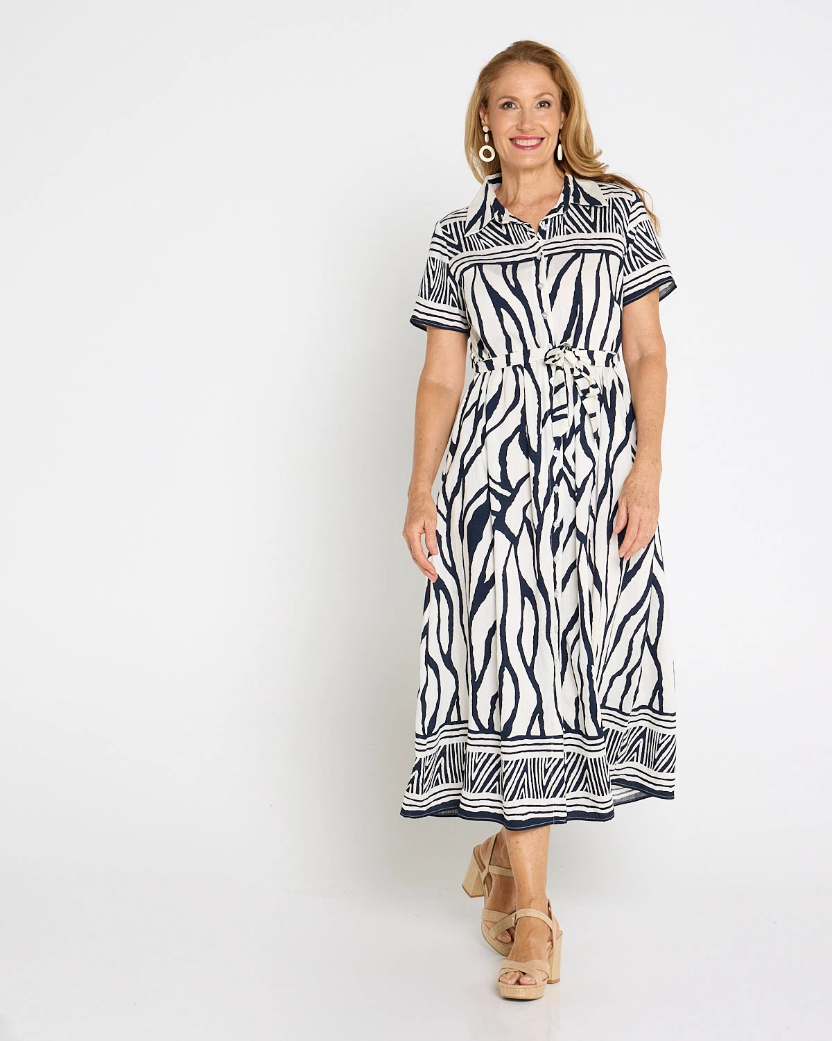 The Averaine Shirt Dress in navy is an effortless “throw on and feel amazing” style with relaxed elegance and bold print impact. Crafted from a lightweight crinkle-style rayon-nylon blend, it drapes softly through the body while staying airy and comfortable on warm days. The button-through front and softly gathered dropped-waist seam create an easy, flattering silhouette, while the optional matching tie belt lets you wear it loose or define the waist. Finished with contrast-print cuffs, handy side pockets, and a sweeping maxi length, it’s a versatile piece you’ll reach for on holidays, long lunches, weekend markets, and everyday wear.