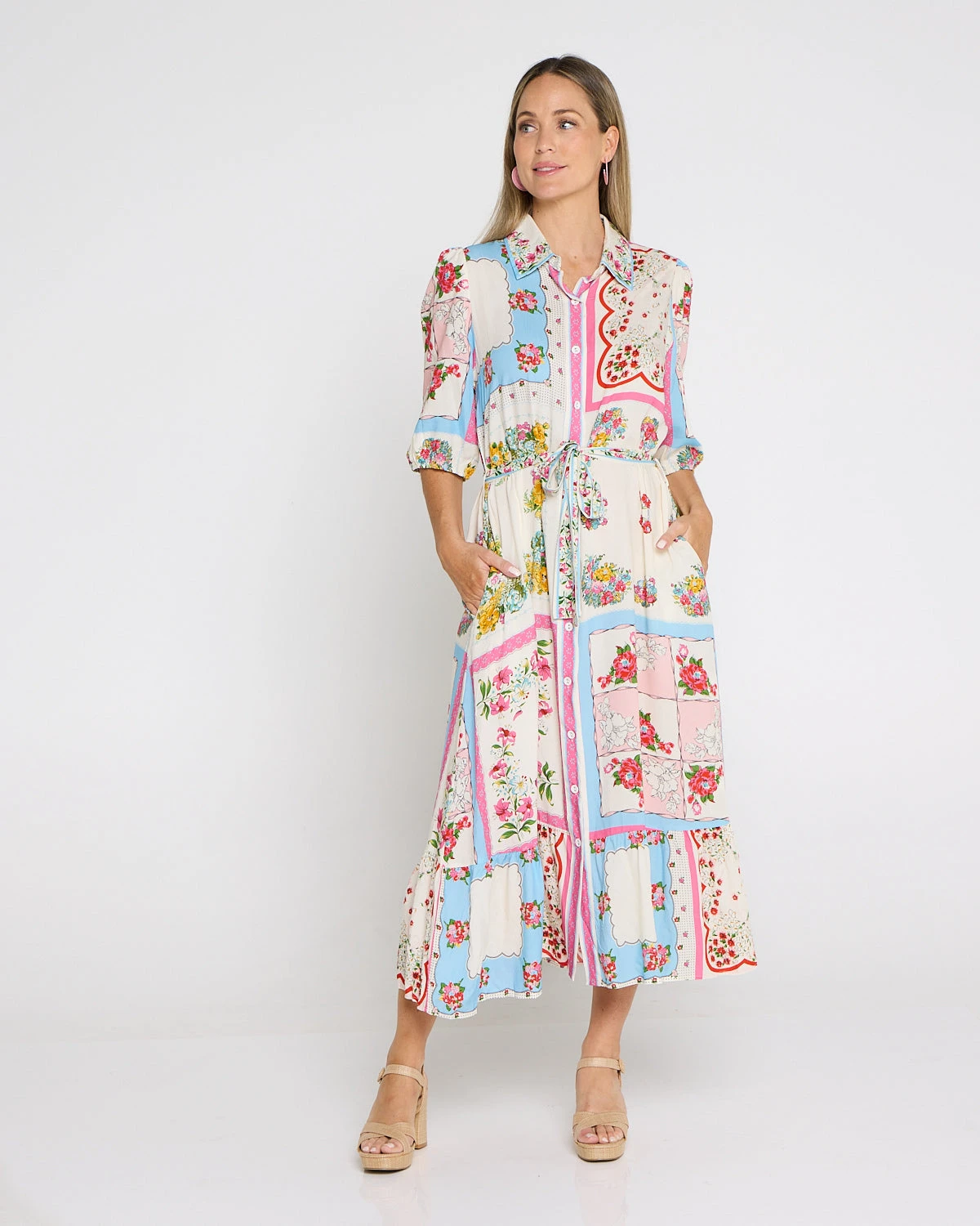 The Averaine Pink Print Dress brings a romantic patchwork of florals and soft pastel tones to easy spring-summer dressing. Designed in a classic shirt-dress silhouette with a collared neckline and button-through bodice, it offers a polished look that still feels relaxed. The adjustable drawstring waist allows flexible shaping, while the tiered midi skirt adds soft movement for warm days, casual events, and weekend plans.