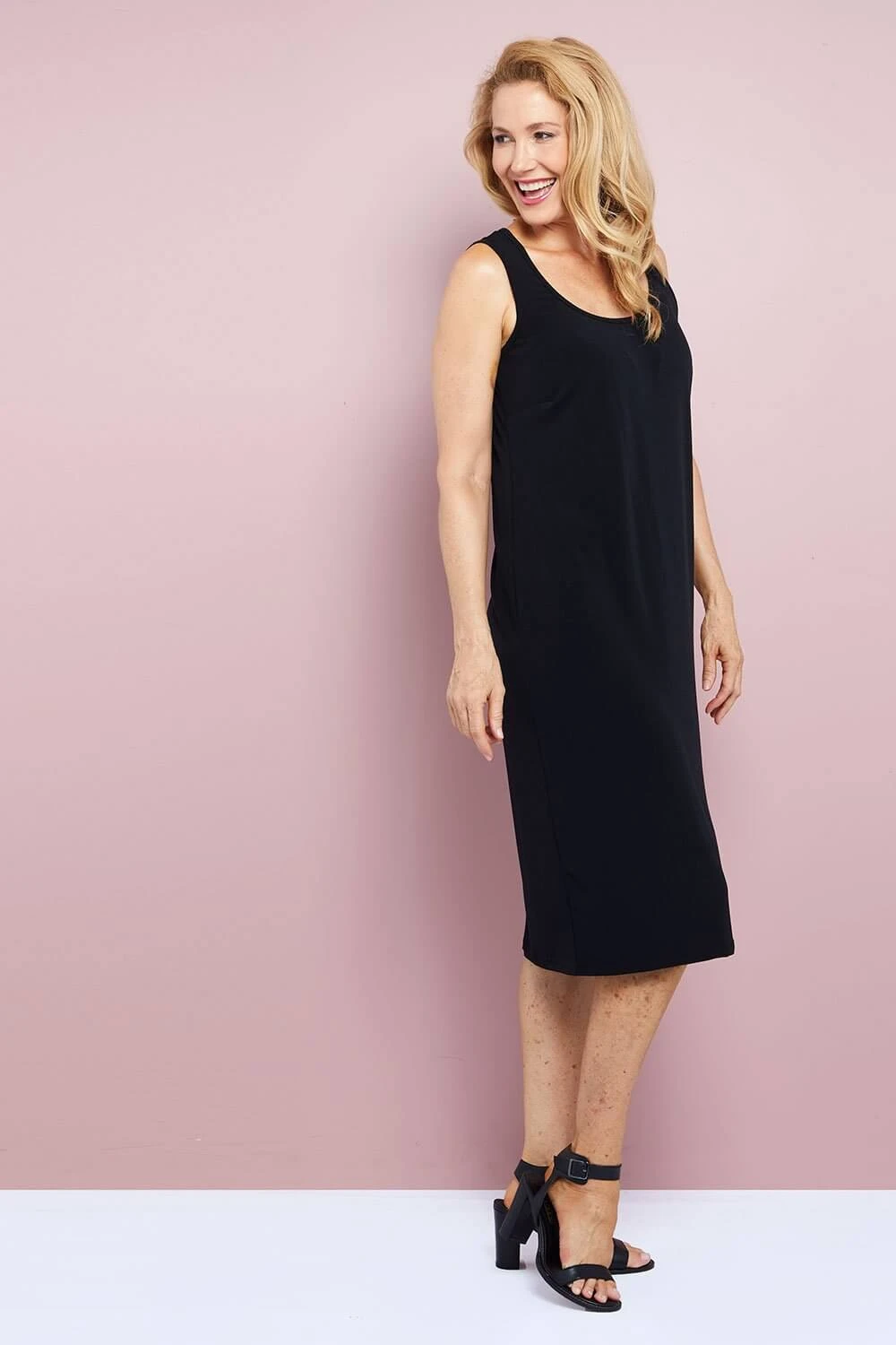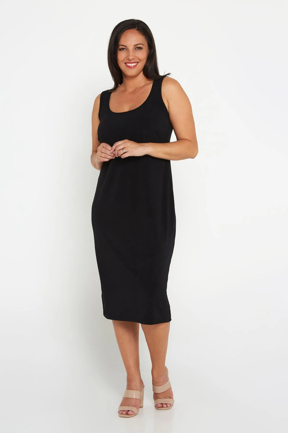 The Averaine Soft Knit Slip Dress in black is a sleek, minimalist essential designed to deliver maximum impact with clean lines and a timeless silhouette. Crafted in a smooth mid-weight stretch jersey, it follows the contours of the body without restricting movement, creating a refined look that feels as good as it looks. With a simple scoop neckline and sleeveless cut, it works beautifully on its own for an elegant evening outfit, or as a versatile base layer under blazers, wraps, or statement outerwear.