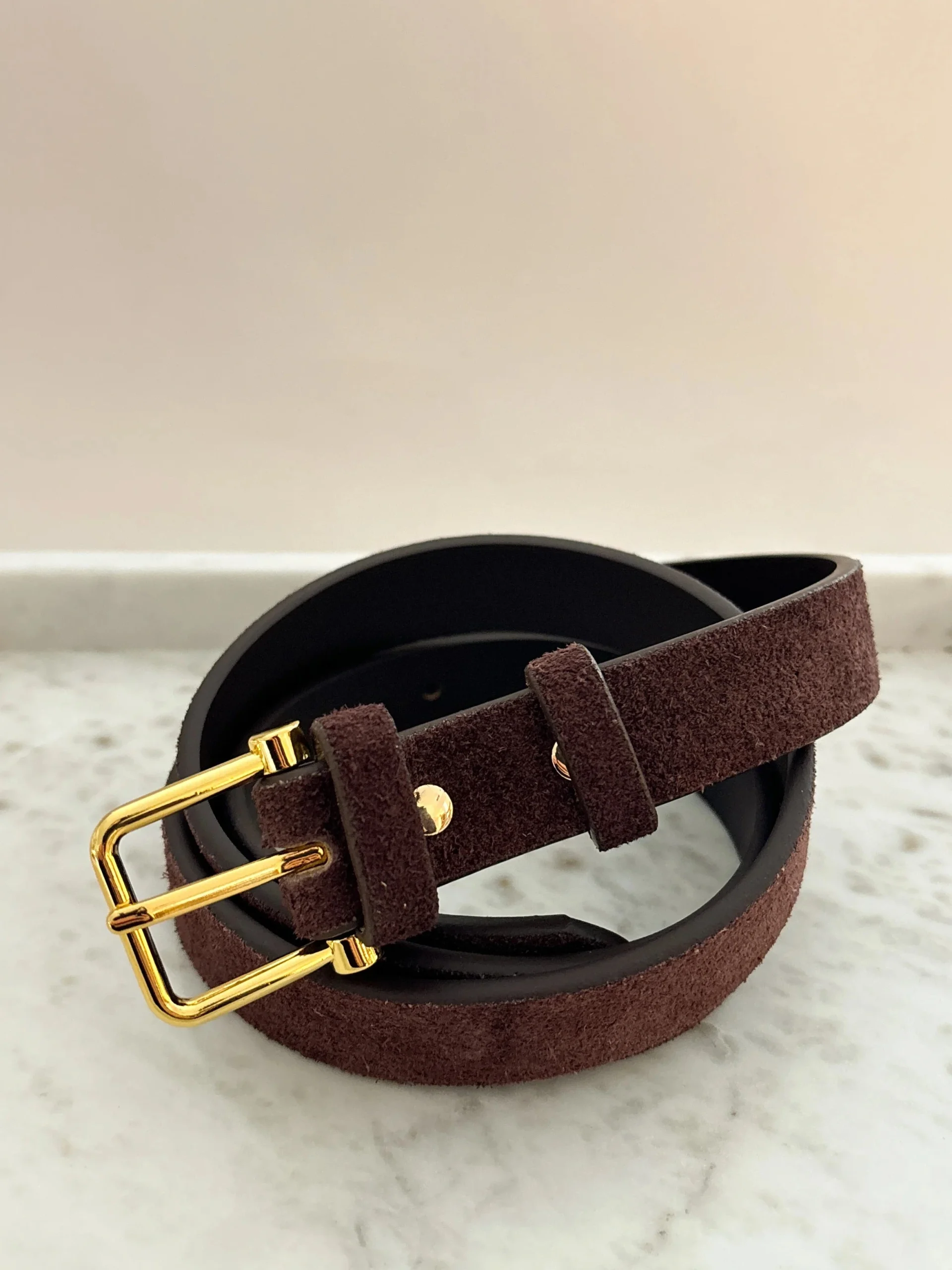 Designed in a longer length for flexible styling, this belt can be worn traditionally through belt loops or styled loosely over dresses and layers for a more relaxed, modern feel. The wider profile adds subtle structure without looking bulky, while the soft suede finish keeps it wearable and elevated.
