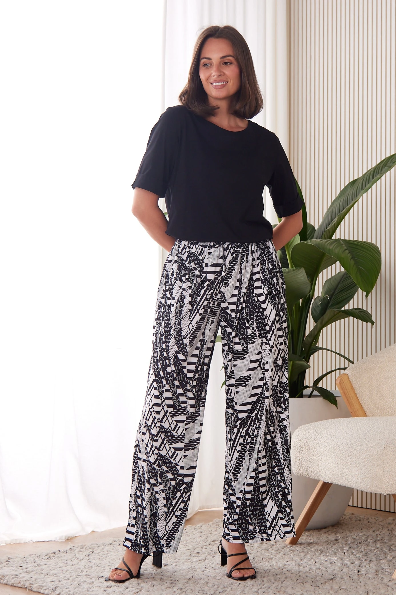 Breezy, light, and effortlessly polished, the Averaine Lightweight Pants in Black are made for warm days when comfort matters just as much as style. The wide-leg silhouette skims rather than clings, creating a floaty drape that feels easy and looks elevated. A soft elasticised waistband with an adjustable drawstring tie keeps the fit comfortable from morning plans to sunset strolls, while side seam pockets add practical ease. In timeless black, they pair seamlessly with everything-just add a relaxed tee, a linen-look shirt, or a simple tank for instant summer-ready styling.
