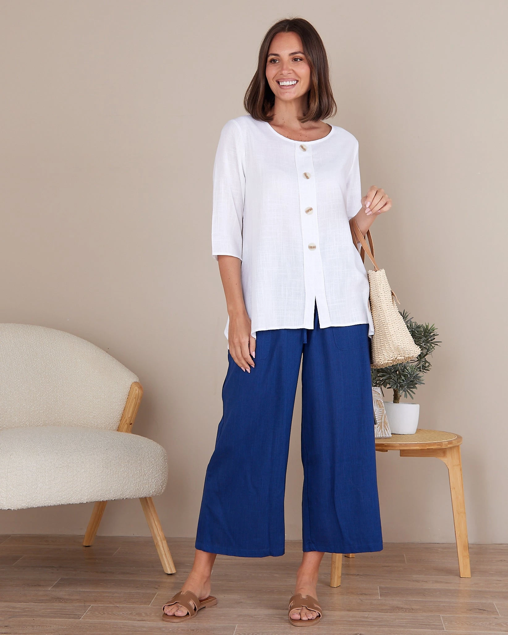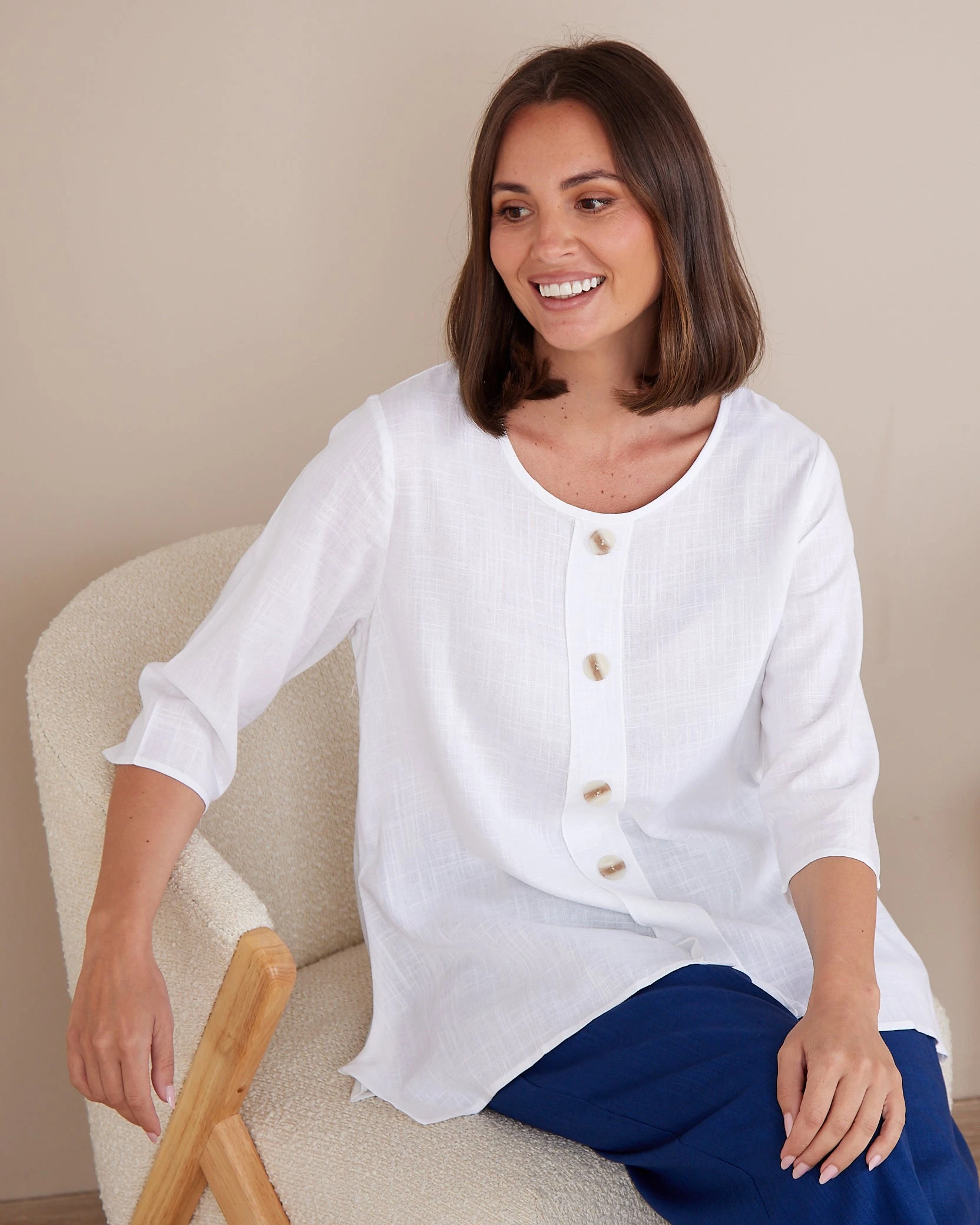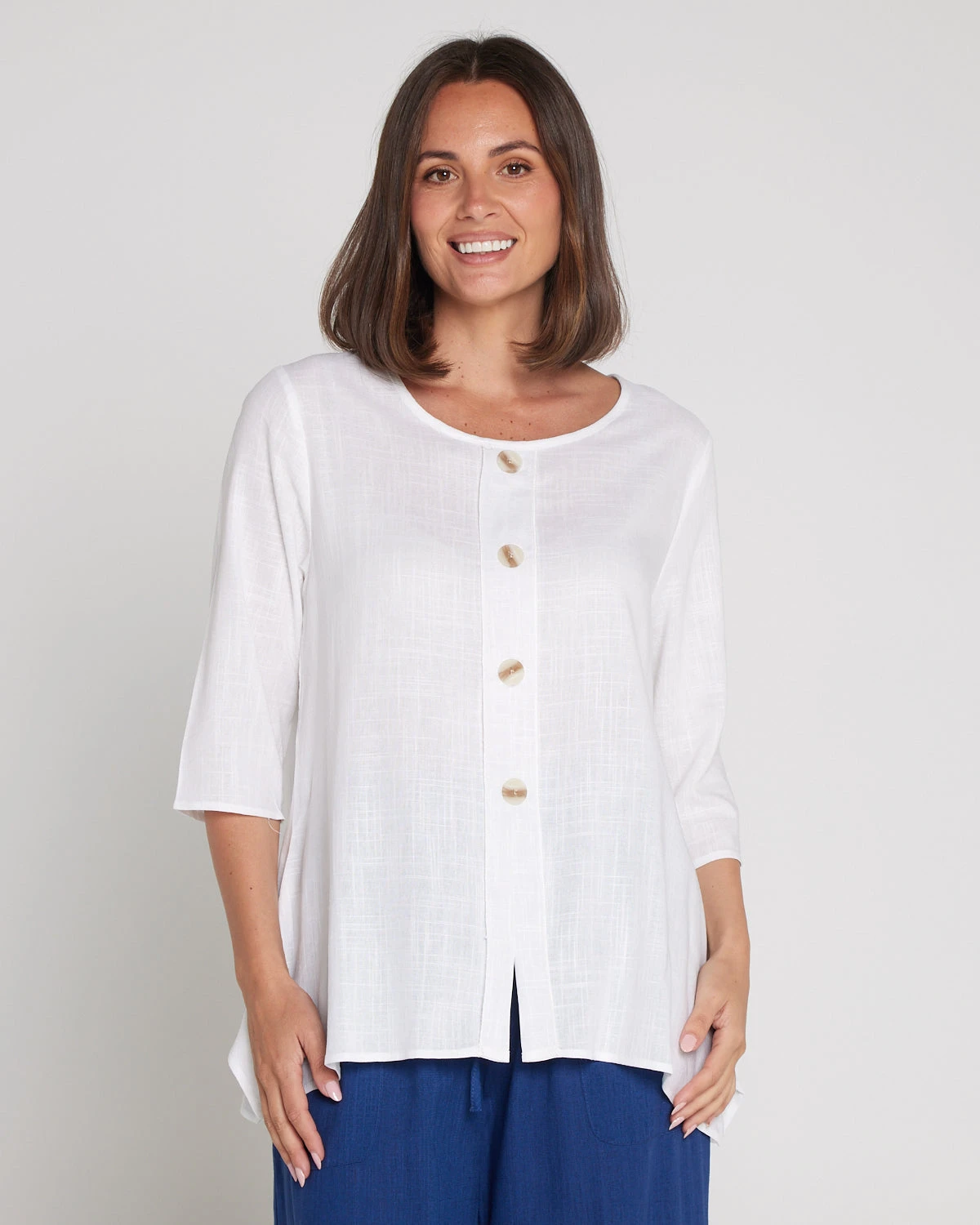 The Averaine Linen-Blend Top in crisp white is a warm-weather essential designed for effortless polish. Cut in a relaxed, flowy silhouette with a soft round neckline and 3/4 sleeves, it offers breathable comfort while still looking refined. Decorative button detailing down the front adds a subtle elevated touch, and the slight high-low hem creates an easy drape that pairs beautifully with both tailored pants and everyday denim.